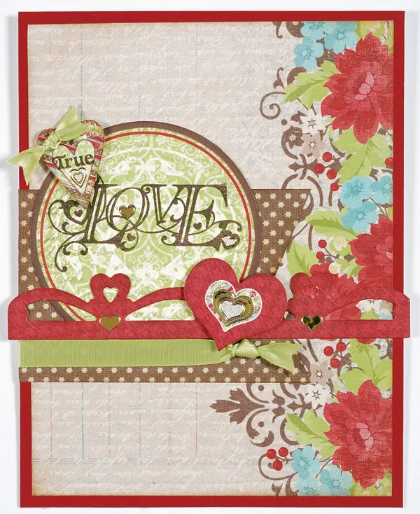 Punch out the Chocolate-Dipped 3" circle, 7/8" green heart, 1 3/8" red heart, and the red border die cuts. Cut the border to 5¼", then ink all the die cut edges. Stamp “love” in the circle, slightly off-center and “true” in the small heart. Glue the circle to the banner, tucking the lower edge under the ribbon. Glue the border above the ribbon, then foam tape the hearts as shown. Knot a 3" green ribbon, trim the ends, and glue to the small heart. Place the Dazzles™ as shown.
