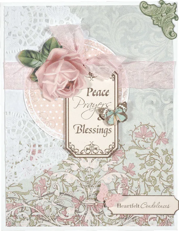 Cut out the Spun Sugar “peace prayers & blessings” and “heartfelt condolences” sentiments. Foam tape the large sentiment and rose over the circle and ribbon as shown. Knot a 4" ribbon and glue it above the rose as shown. Foam tape the blue butterfly to the sentiment. Glue “heartfelt condolences” at the lower right, then foam tape the pink butterfly on it. Glue the corner die cut in the upper right corner, then place the pearls as shown.
