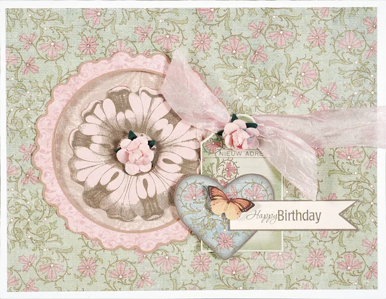 Wrap ribbon across the right end of the card 1 7/8" from the top. Insert the ends through the tag and knot. Glue the tag in place next to the window. Cut out the Spun Sugar “happy birthday” banner, then glue the heart and the banner overlapping the tag as shown. Foam tape the butterfly to the banner and glue a rose below the ribbon knot.