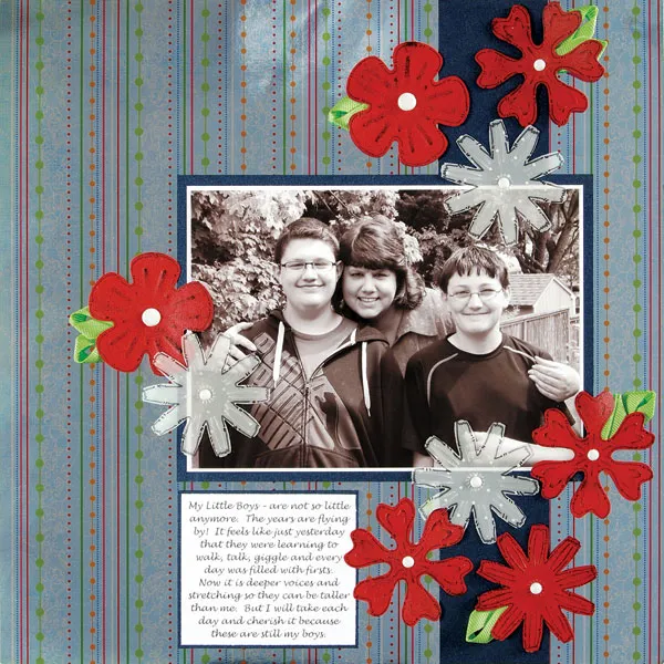 Punch flowers with red glimmer paper and vellum. Ink over the glimmer shapes. Add pen work to the edges of the flowers, brad centers and ribbon loops for leaves. Foam tape the flowers around the photo and to the strip. Attach vellum flowers through the background page to hide the legs of the brads.