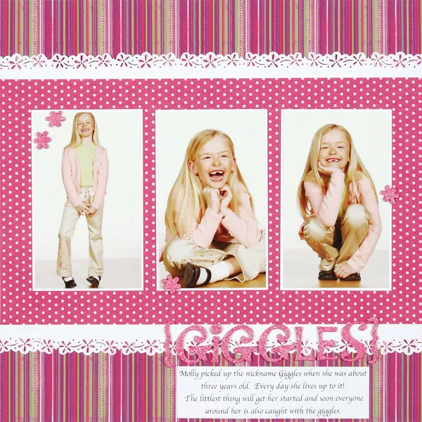 Mat photos with white cardstock and glue to the pink dot paper. Add small flowers around the photos with the Thickers.