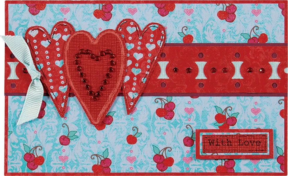Use one length of crystal stickers to make a heart shape on the center cardstock heart, pressing them in place. Add single crystals over the holes in the border as shown. Knot a 4” length of ribbon and glue it just left of the hearts. Stamp “With Love” on cardstock, then trim it and mat it on blue and red. Add foam tape to the back and adhere it to the lower right.
