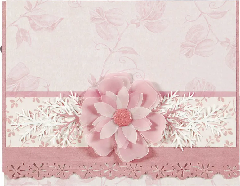 Print the sentiment on the beige/pink flowered paper and trim it to 4½” x 2&rdquo,; then mat it on vellum. Glue this piece to the sprigs, aligning the right edges. Punch two pink and one white vellum cosmos. Punch one white and one pink vellum star flowers. Stack the blossoms, alternating the colors and secure with a pink embossed brad. Glue the flower at the upper left of the sentiment. Punch and glue two rose and one white pine branch on each side of the flower, angled as shown.