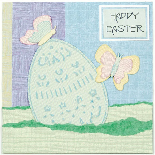 Cut out the stenciled egg and glue it to the card front, tucked under the lower piece of torn cardstock and angled as shown. Punch butterflies from the pink, yellow, and light blue cardstock. Punch all of them twice so you have doubles of all the wings. Sand all the wings and four bodies, then construct two butterflies for the card front. Glue them in place.