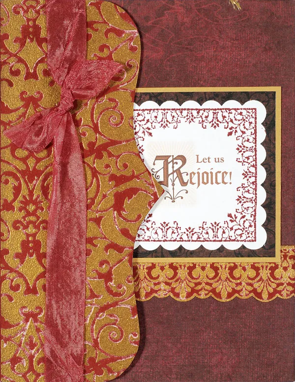 Ink the flourish flap edges. Wrap with ribbon, ¾" from the fold and knot at the upper front. Glue to the cardstock flap. Glue the folded edge of the flap to the inside along the left edge so it wraps over the front. Cover the card front with Nona’s burgundy border paper, positioning the border as shown. Ink the edges. Glue a 5" gold border across the front, 1 3/8" from the lower edge.