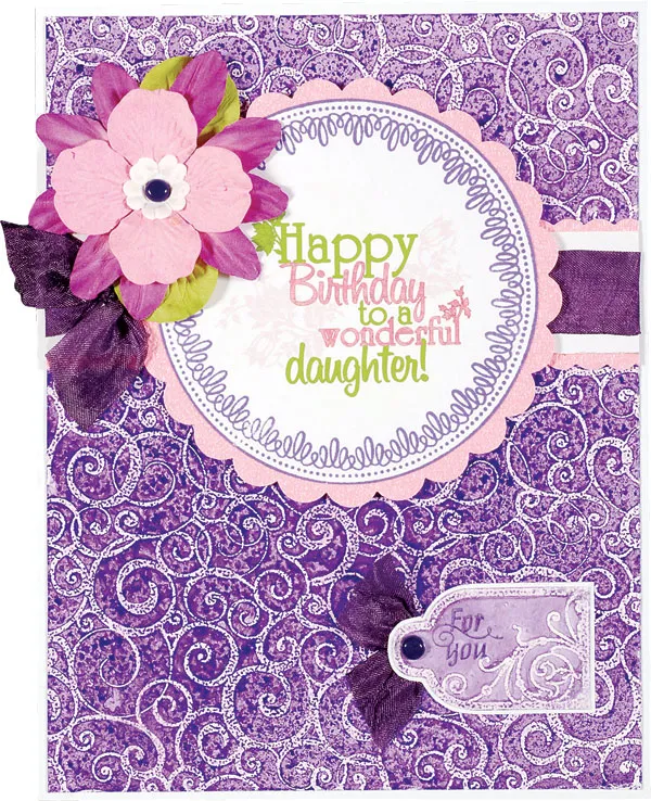 Copy and size the greeting to 2¼"wide. Print on white paper and stamp the large circle around the greeting. Punch a cardstock circle, cut out the greeting, and glue to the circle center. Foam tape the circle to the border. Knot a 3" purple taffeta ribbon and glue left of the circle. Stack the purple, pink, and white flowers as shown and secure with a mini brad. Glue above the knot, then cut two petals off the green flower and glue under the flowers for leaves.