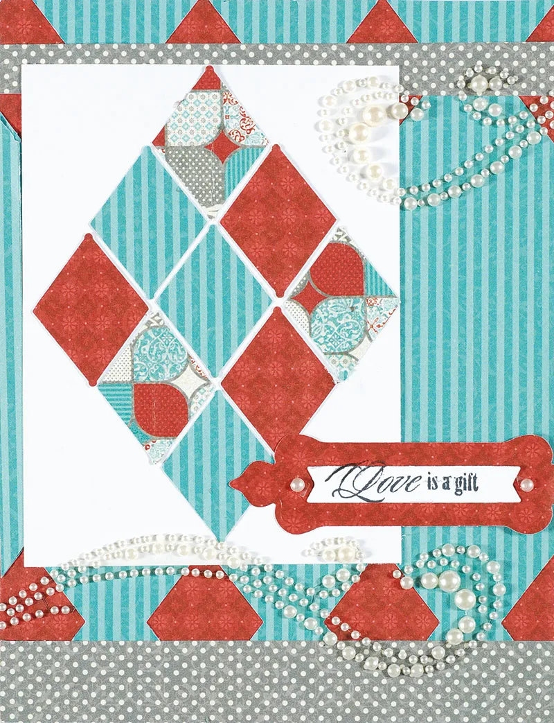 Using 6 Layered Labels cutting die, cut a small label with Robin’s Red red patterned paper and a small banner from white cardstock. Stamp “Love is a Gift” onto the small banner. Glue the banner to the red label. Glue even with right side and 1¾" from bottom. Add Pearl Eternal Swirls as shown.