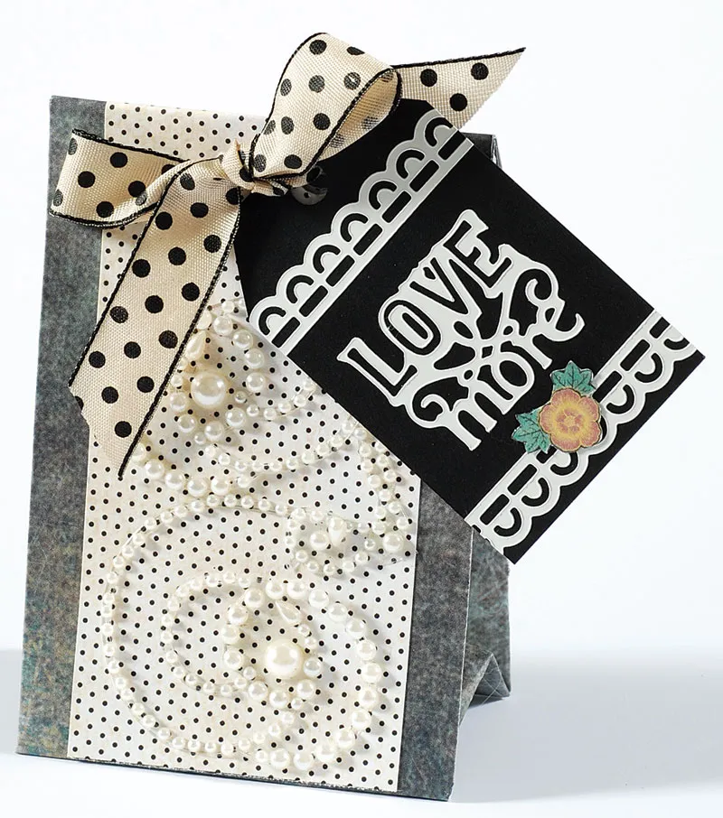 Cut 2”x4 1/2” Chalkboard white dot patterned paper. Glue to the bag centered on the front. Place Pearl Allure Swirl to the white dot as shown. Apply the glue to the tab and glue the box sides together. Glue the box bottom together. Fold the top over 1” and punch twice with a hole punch. Cut 1 5/8”x2½” black cardstock. Place Chalkboard Sayings Dazzles™ “Love More&rdquo,; and the border as shown. Glue the small flower from the Chalkboard floral patterned paper centered and 1/8” from the bottom. Cut 6” Chalkboard white polka dot ribbon and thread it through the punched holes in the bag. Punch a hole in the top of the tag and thread it onto the ribbon and tie a bow.