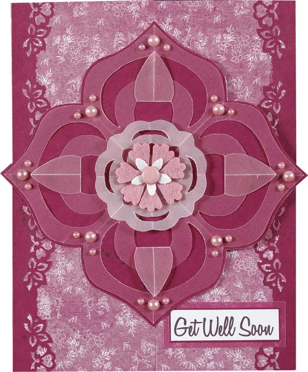 Glue the orchid to the left front flap on the card, leaving the right side unglued. Add clusters of one large and two small pearls around the edge of the orchid as shown. Print “get well soon” in burgundy on white paper. Mat it on burgundy, then on pink vellum and glue to the right flap as shown.
