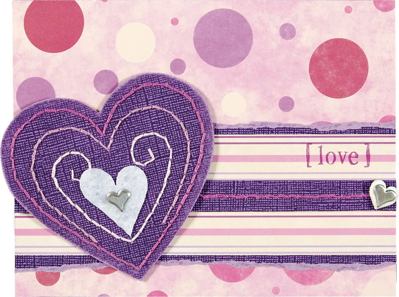 Glue the stitched strip in the center of the stripes piece and add a white heart brad to the right end. Stamp “[love]” to the right end as shown. Glue the piece across the card front, ½” above the lower edge.