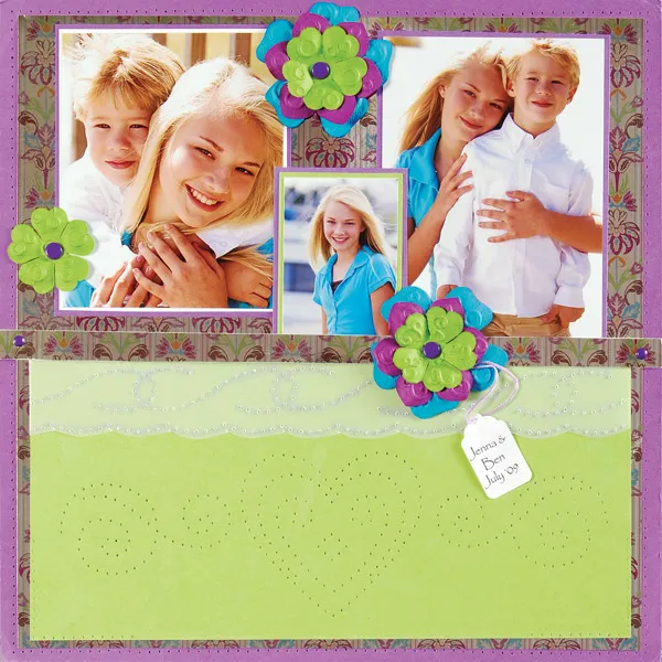 Layer flowers for the right side of the border and top center. Secure a tag with floss and glue under the border flower. Glue a single lime flower to the bottom of the left photo.