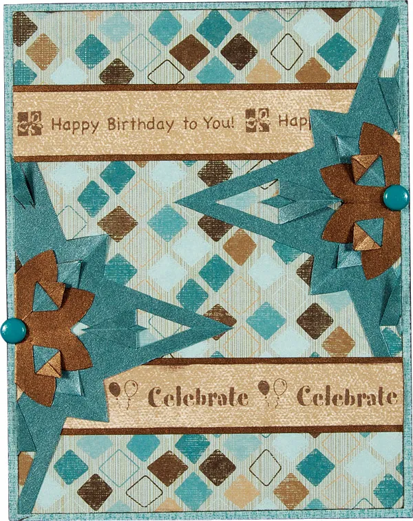 Cut two 4¾” x ¾” strips of tan canvas textured paper. Ink the edges, then stamp one with the “happy birthday” border and the other with the “celebrate” border. Mat both on brown glimmer paper. Glue the “happy birthday” border to the diamonds paper, 1” from the upper edge. Glue the “celebrate” border 1” from the lower edge.