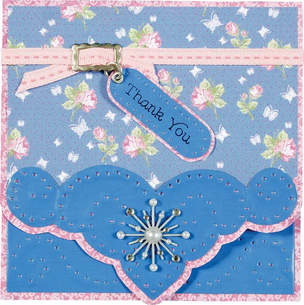 Place a 6” x 3” piece of the periwinkle metal on the mouse pad and pierce the holes for the scroll design centered on it. Cut around the outside of the design. Add a starburst brad to the center of the metal. Glue this piece over the lower edge of the blue flowered paper, leaving 1/8” of the pink showing at the bottom point. Cut around the lower edge of the metal, leaving a pink mat.