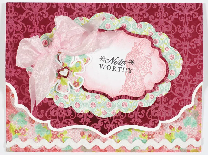 Inside: Cover with rose paper. Ink the edges pink. Stamp the sentiment and a swirl with black on cardstock as shown. Stamp a rose bouquet with pink above the sentiment. Ink around the images with pink. Trace Scalloped Tag around it and cut out. Mat on purple with 1/18” borders. Foam tape on the center as shown. Stamp a stamp with black on green roses. Ink around the image with pink. Trace Elegant Tag around it and cut out. Mat on cardstock with 1/16” borders. Foam tape to the left of the tag. Zot™ a knot of ¾” dark pink sheer ribbon above Elegant Tag. Zot 6 ½” of white mini rick rack on the bottom. Mat two hearts Dazzles™ on purple with 1/16” borders. Glue above the sentiment.