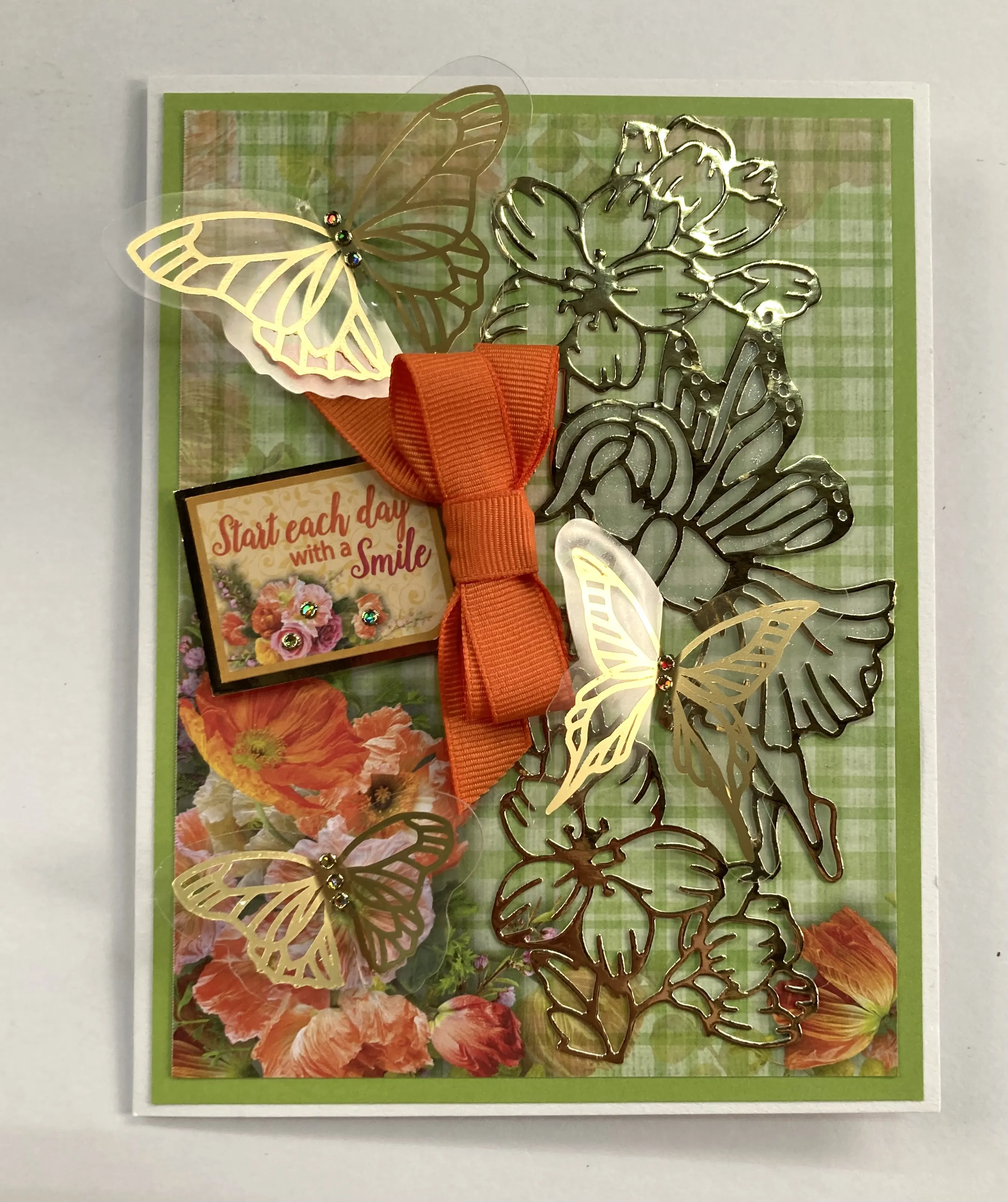 Cut out the "Start each day..." from the 6"x6" cardstock set and mat on the rich gold Miri leaving a 1/8" gold border. Foam tape at an angle as shown. Zot™️ a 2" wide bow as shown. Select three acetate butterflies and fold on each side of the bodies. Zot™️ as shown. Place Jewel Dazzles™️ stickers along the bodies and on the sentiment as shown.