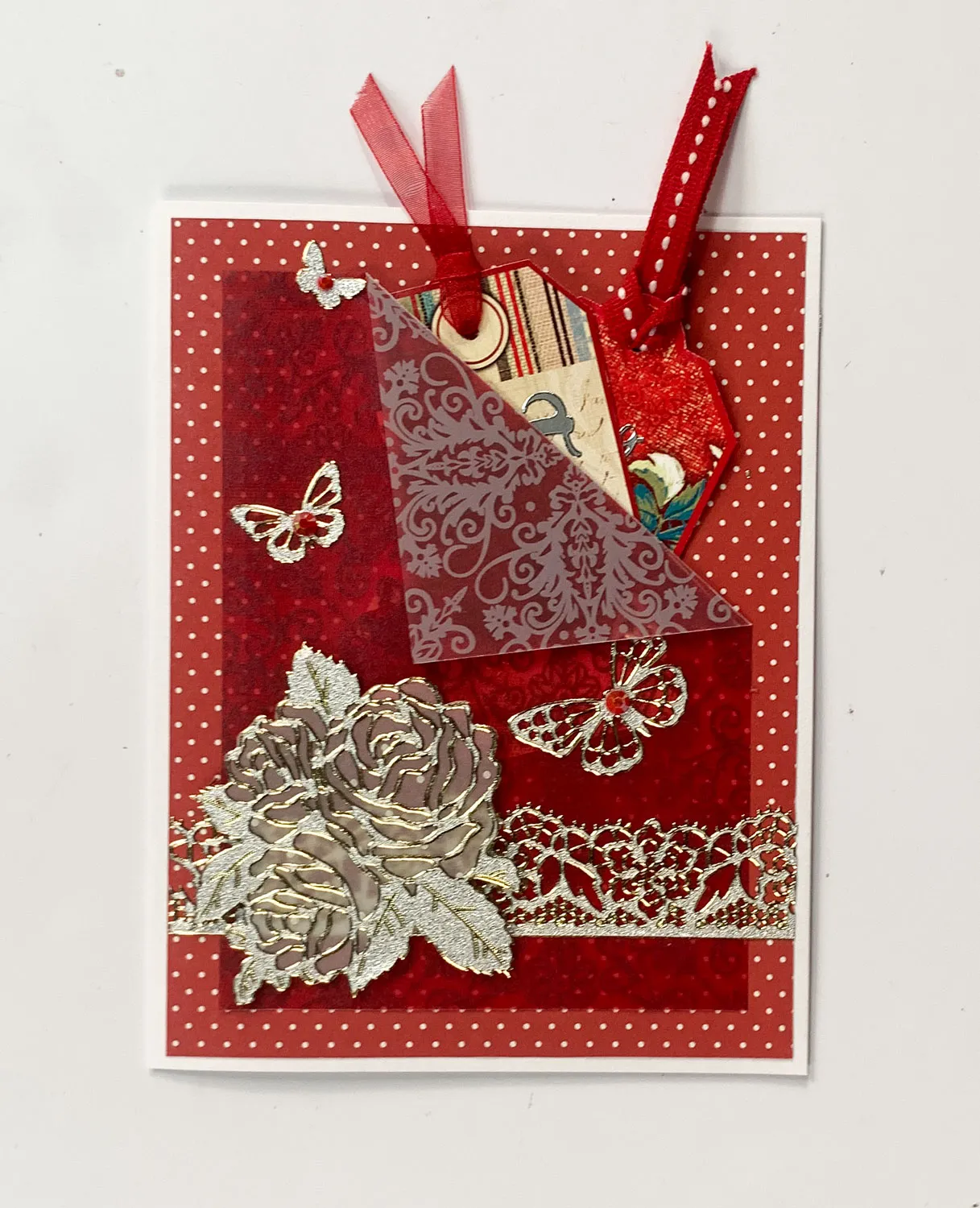 1. For the card front: Place the card with the fold on the left. Cut 4¾"x6¼" Dotted Duos red mini dot paper and glue it centered on the card front. Cut 4"x5½" red tapestry patterned vellum. Measure 1" in from the left edge along the top and 2½" down from the top along the right edge and mark both points. Use the ruler and bone folder to score a line between the two points. Fold the vellum down on this score line.