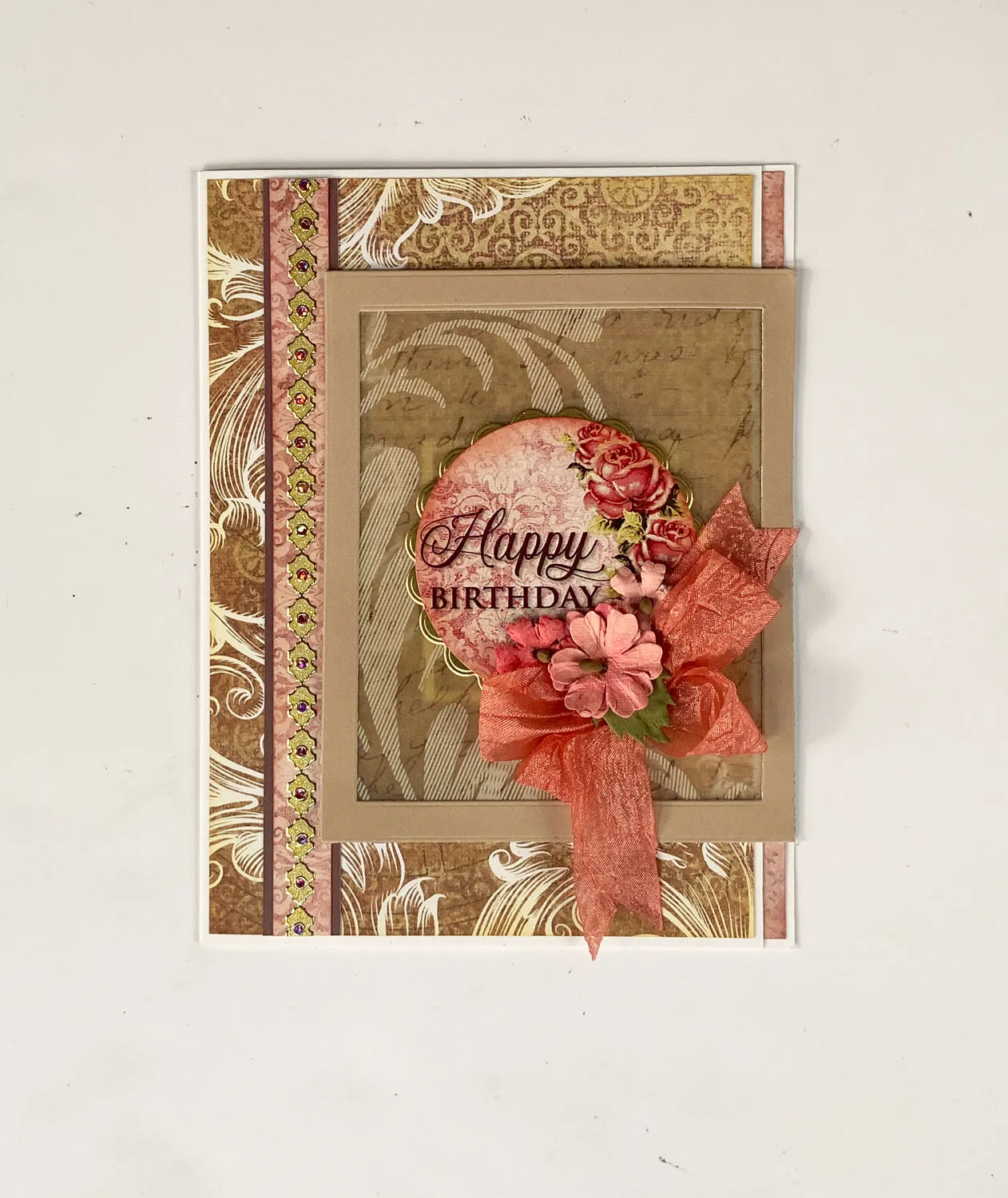 6. Close the frame front. Die cut a 2½" scalloped circle from Gold cardstock. Ink the edges of the “happy birthday” die-cut with Bordeaux, then glue it centered on the Gold circle. Glue it centered in the frame, covering the greeting on the card front.