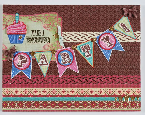 Stamp “make a wish” on the right end of the green/pink label, then trim ¾" off the left end. Glue to the front as shown. Follow the package directions to punch out and assemble the banner papier tole piece. Glue it to the front as shown. Assemble the cupcake extra art and glue to the label near the left edge. Knot a 2" ribbon, trim the ends, and glue to the label right end. Place the Dazzles™ stars as shown.