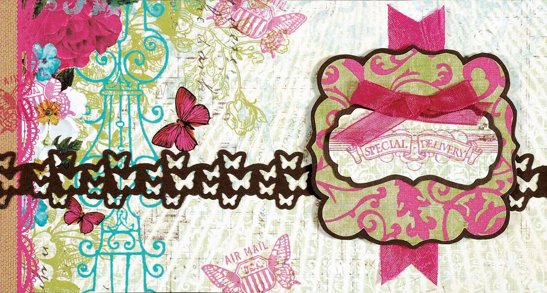 Cut the ends of 3 1/2” pink crepe ribbon into V shapes and glue vertically to the card 1 1/4” from the right. Stamp “Special Delivery” on the light green portion of the floral corner paper. Trace Bracket Label B from the Layered Labels Template around the greeting and cut out. Mat on brown cardstock with a 1/16” border. Cut Bracket Frame B from pink/green flourish and mat on brown cardstock with a 1/16” border. Glue the greeting centered on the Bracket Frame. Foam tape the Bracket Frame to the card 3/8” from the right, centered over the ribbon. Tie a small bow of pink sheer ribbon and use a Zot™ to attach at the top of the greeting.