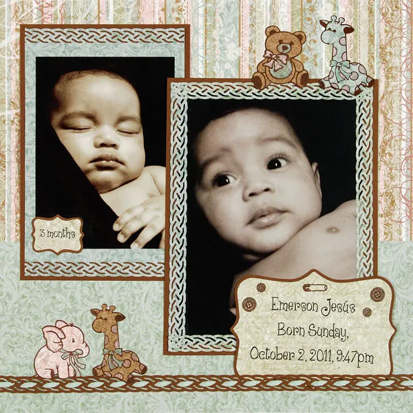 Stamp giraffes on blue and brown papers and cut out. Stamp and cut out a pink elephant and a brown bear. Glue the elephant and brown giraffe on top of the woven border on the left side. Glue the bear and the blue giraffe at the top of the large photo on the right side. Color in the details of the stamps using pink and blue Smooch ink. Stamp a few buttons and a safety pin on the large caption.