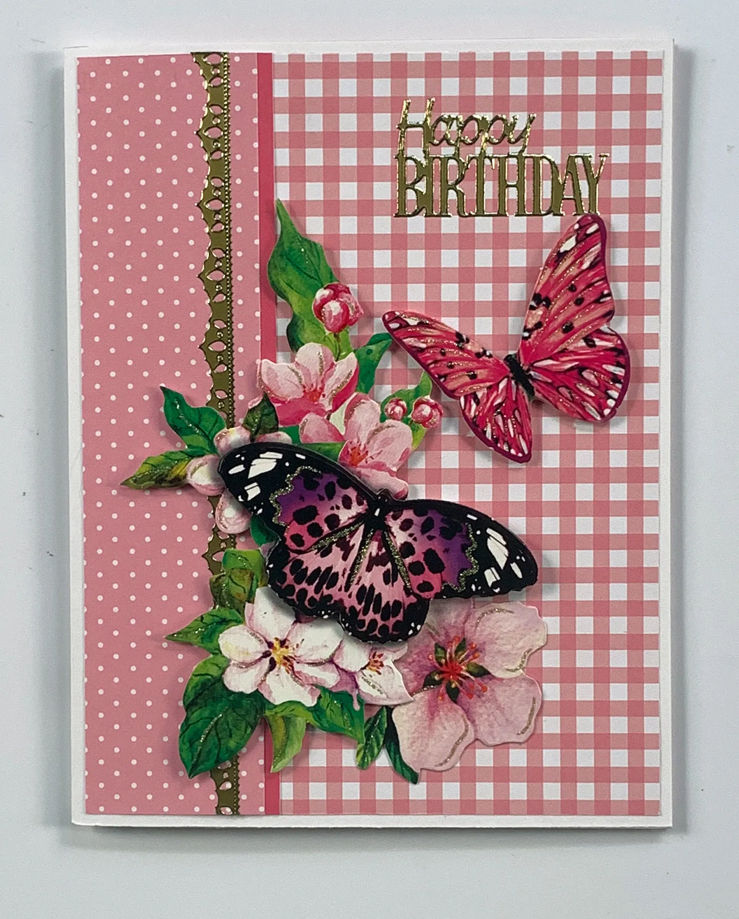 Remove the bright pink butterfly die-cuts from the package and set the bottom and top layers aside for the inside. Cut the pink butterfly and largest flower from the middle layer die-cut. Foam tape the butterfly below the sentiment as shown. Glue the large flower to extend from under the purple butterfly flower cluster at the lower right.
