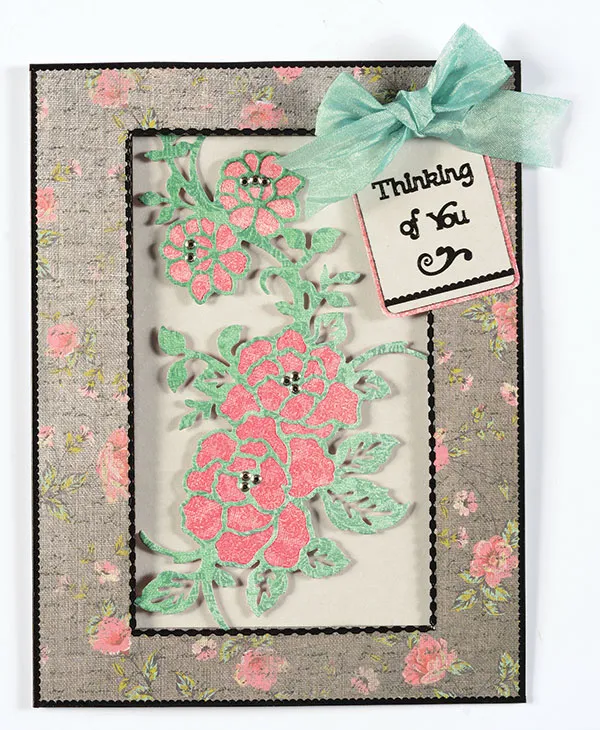 Place Black Thin Lines Dazzles™ at the edges of the card and window. Use the tiny Tags & Little Labels to trace the Squared Tag E and Squared Tag D shapes onto light gray pastel cardstock. Remove the template and cut out the shapes. Ink the edges of the large tag with black ink, then mat on Charming pink flourishes paper with 1/16” borders. Place Tiny Words & Phrases Dazzles™ “Thinking of You” and a flourish centered on the tag as shown. Add Thin Lines Dazzles™ across the bottom. Glue the tag angled on the card, near the top right corner. Use 3/4" wide aqua crepe ribbon to tie a bow. Trim each tail into a “V”. Zot™ the bow on the top of the tag as shown. Ink the edges of the remaining tag with black ink and save it for the inside.