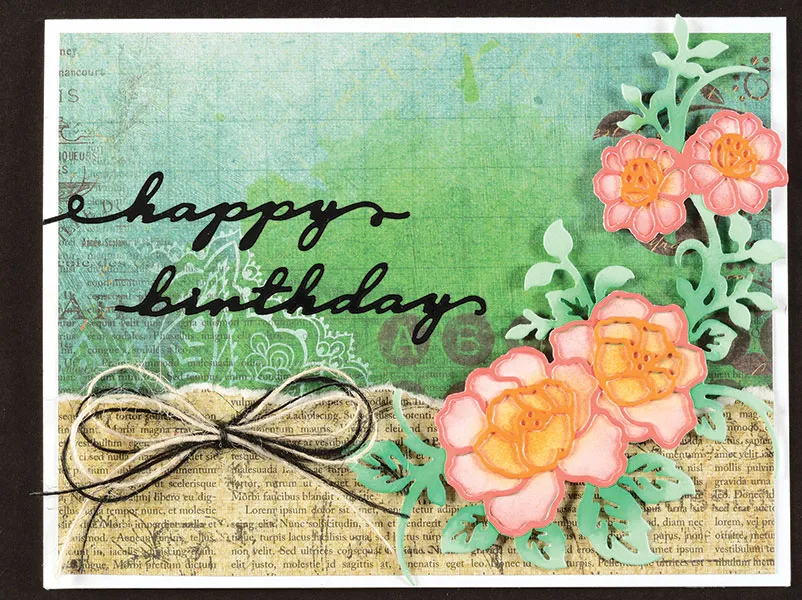 Use your die-cutting machine to cut three rose sprays from white cardstock. Use a cosmetic wedge to apply cracked pistachio and lucky clover inks to the leaf and stem areas of one die-cut. Apply abandoned coral to the flower areas of another die-cut, then cut out the flowers and glue onto the flowers of the green inked die-cut, matching the edges. Apply carved pumpkin to the flower centers of another die-cut, then cut out the flower centers and glue onto the centers of the coral inked die-cuts.