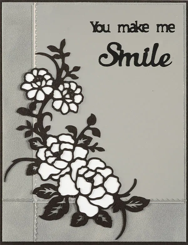 Use your die-cutting machine to cut one rose spray from black cardstock. Cut one large flower shadow and two small flower shadows from white cardstock. Glue the shadows behind the rose spray, matching the edges, then glue the piece in place, as shown. Place “You make me Smile” Dazzles™ as shown.
