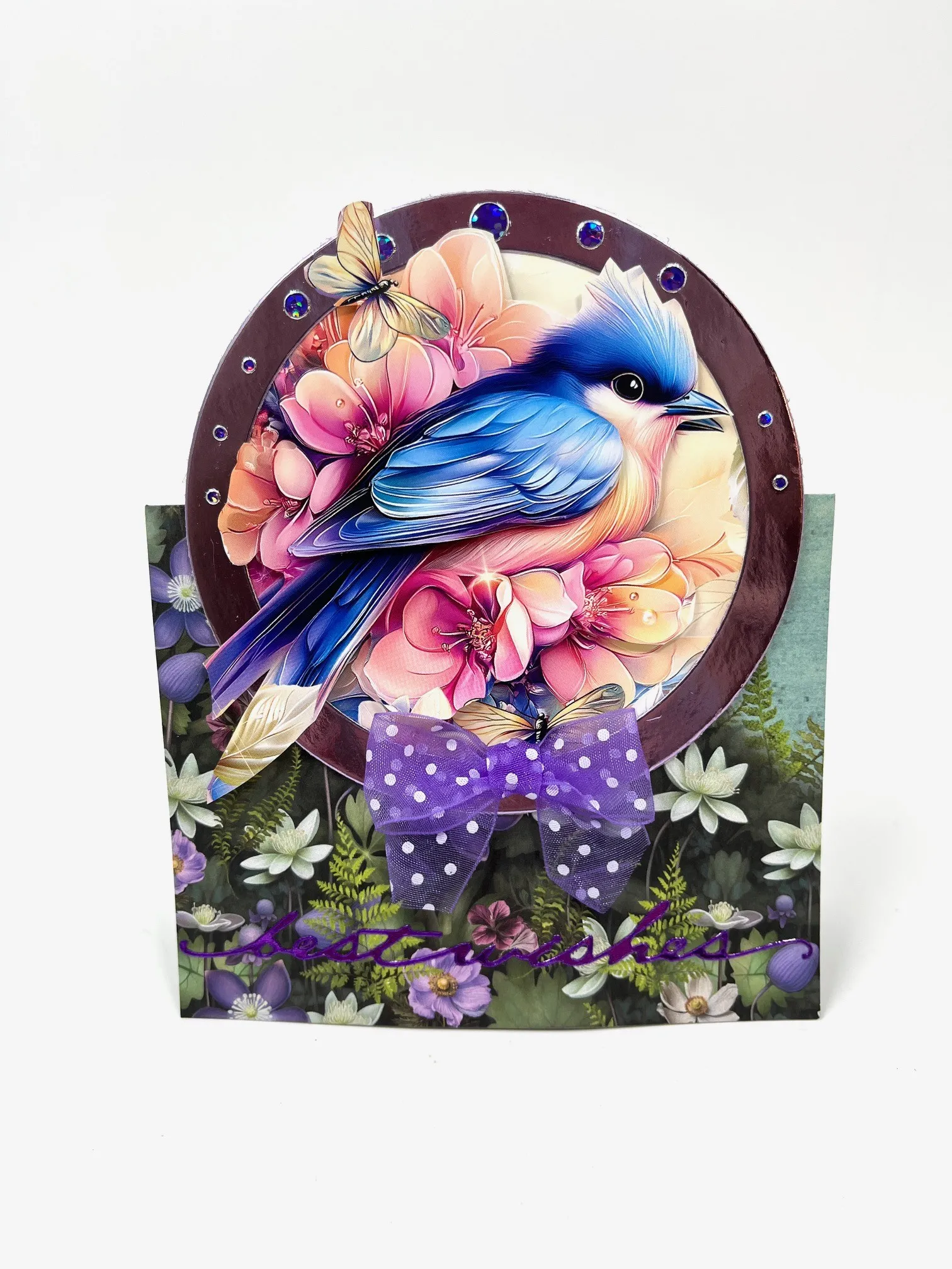Use Mystical Florals and lavender Mirri with the Circle Stand Up Card Dies. Follow the instructions on the package; however, use the birds from the Square Little Book for the circle cuts. On the front and back, cut out the bird with flowers from the background and foam tape over the matching art. Repeat cutting out just the wing and foam tape in place. Make and Zot™️ a 2” wide bow from the Purple Ribbon Set and place at the bottom of the bird on the front. Place purple Jewel Dazzles™️ around the mirri circle. Place purple “Best Wishes Dazzles™️ at the bottom.