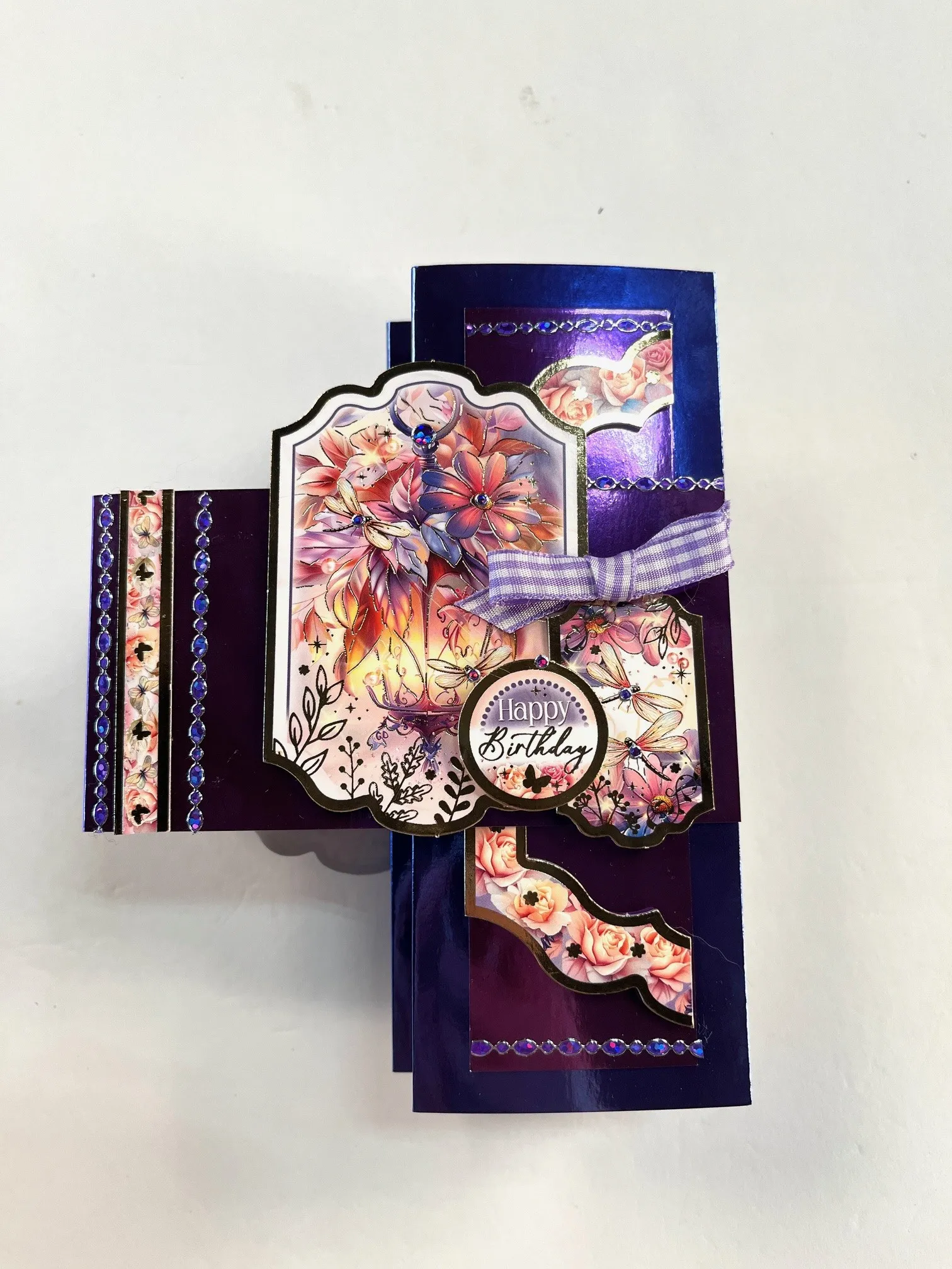 Cut 2 1/2”x10” purple Mirri and fold in half. Tape the ends to each end of the card 2” from the card top. Use extra sticky tape to attach the border ¼” from the fold. Foam tape Toppers along the center band as shown. Place purple oval Dazzles™️ where shown and purple jewel Dazzles™ on the toppers.