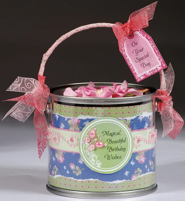 Add a pink flower to the top of the pail. Wrap the handle with pale pink organdy swirl ribbon, tying a knot at each end to fix. Add some extra ribbons knotted at the ends of the handle. Cut out a pink tag, journal across the center, and punch a hole at the top. Tie with a bow of darker pink organdy swirl ribbon to the top of the pail handle.