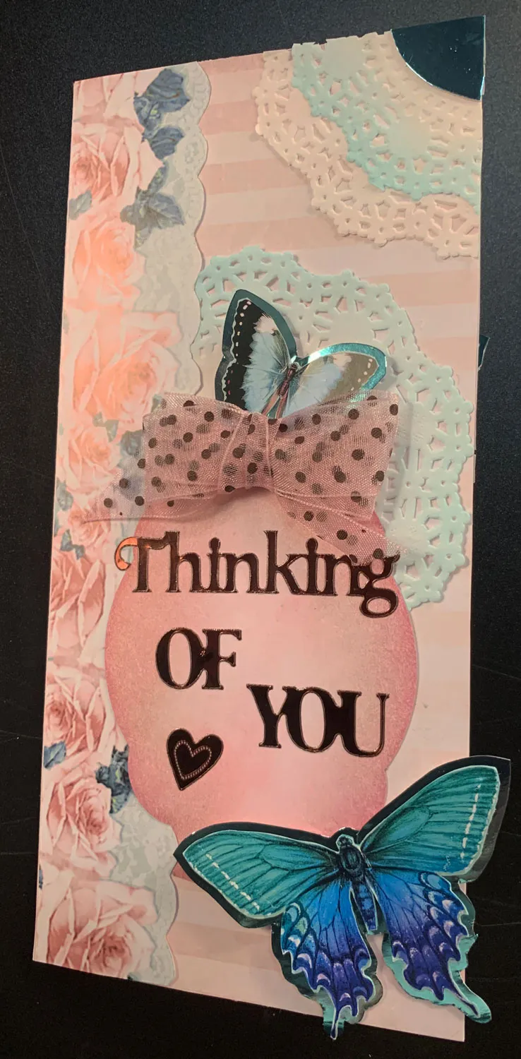 Inside: Cut two 2”x8” dark butterfly pieces and glue along the fold, but don’t overlap the fold. Glue two 2”x8” pink stripe paper and glue to the outside edges. Cover the tunnel piece with the border butterfly paper, trimming so you don’t cover the folds. Tape the light pink baker’s twine (from the ribbon set) to the back of the center mountain fold. Glue the tunnel piece onto the base lining up the center folds of each piece. Cut out a butterfly and mat on Mirri with a 1/8” border. Cut out another identical butterfly only from Mirri and foam tape a few small butterflies to it. Glue these back to back over the center of the string. Place a Dazzles™ sentiment and Zot™ a bow. Glue doilies at the corners with Mirri 1 3/4” and 2 ¾” circles in the middle of each.