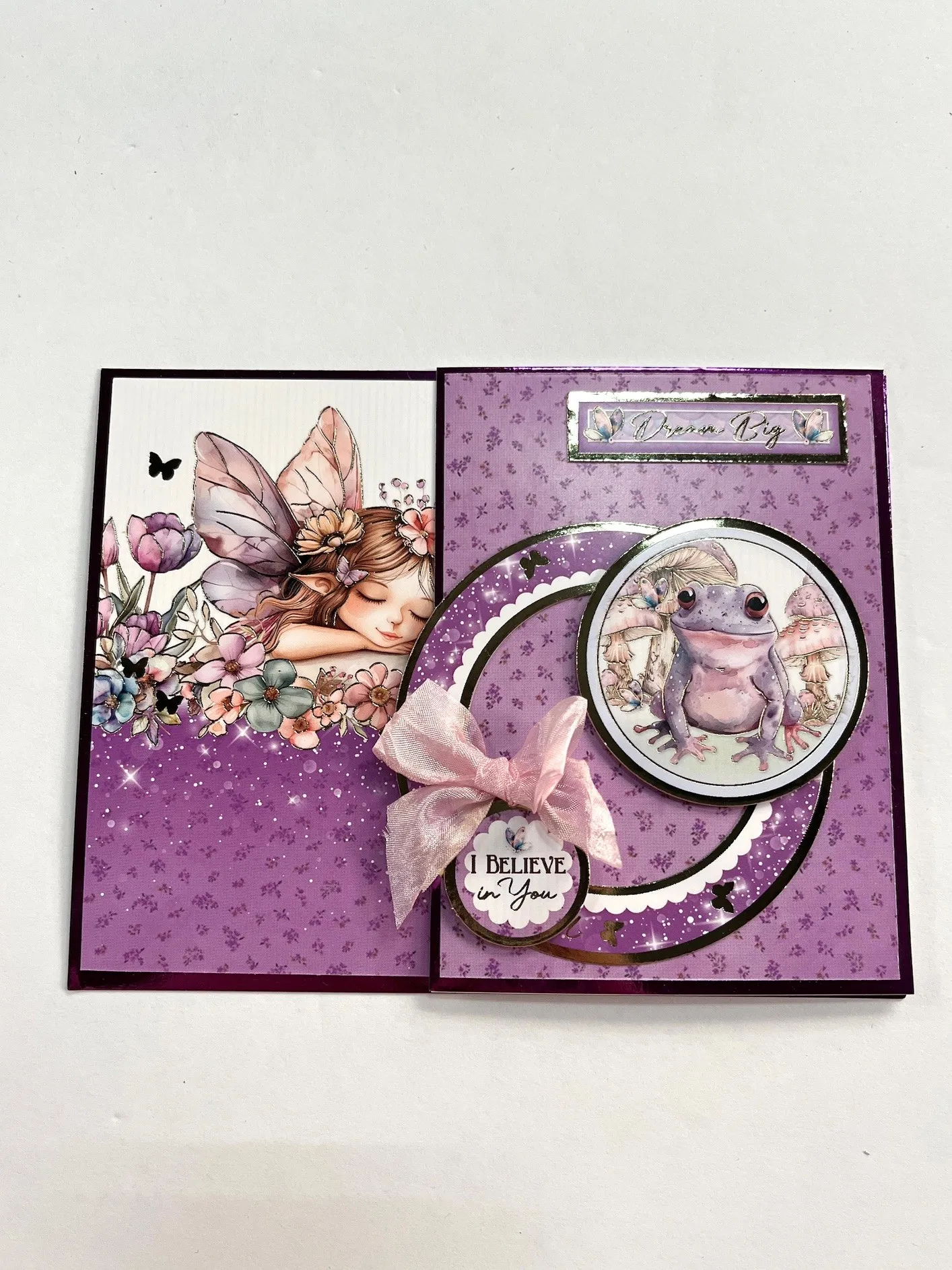 Tape the outer frame from the frog Topper 1/4” from the bottom and hanging over left side by 1/4”. Foam tape frog Topper over frame on the right side. Foam tape the small “I Believe In You” circle Topper over the frame as shown. Make and Zot™️ a 2” wide crepe bow from the Light Pink Ribbon Set and secure over the small Topper as shown. Tape “Dream Big” 1/4” from the fold and right edges.