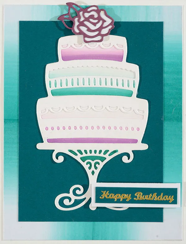 Cut 4”x5½” white cardstock. Using another 4”x5½” white cardstock and cut the cake shape. Place the die-cut aside, and use the negative piece to trace the outline of the cake in the center of the 4”x5½” cardstock. Lightly trace the cake outline where each layer ends. (You do not have to trace the cake stand.) Start with the top cake layer, and the PR4 pen. Place the brush nib in the mixing chamber for about 30 seconds, holding the pen vertical. Start at the top of the layer, and sweep the pen back and forth until you see color. Continue so that the most intense color is at the bottom of the layer. (Don’t worry about staying in the lines, because you will cut the cake out later.) Go to layer #2 and using the BG4 pen repeat the same process. Use the PR4 pen to color the last layer, using the same process. Once you have the color done, glue the cake die-cut over the color, and cut the colored layer even with the die-cut. Glue to 3 7/8”x5¼” dark turquoise cardstock. Glue centered onto the card front.