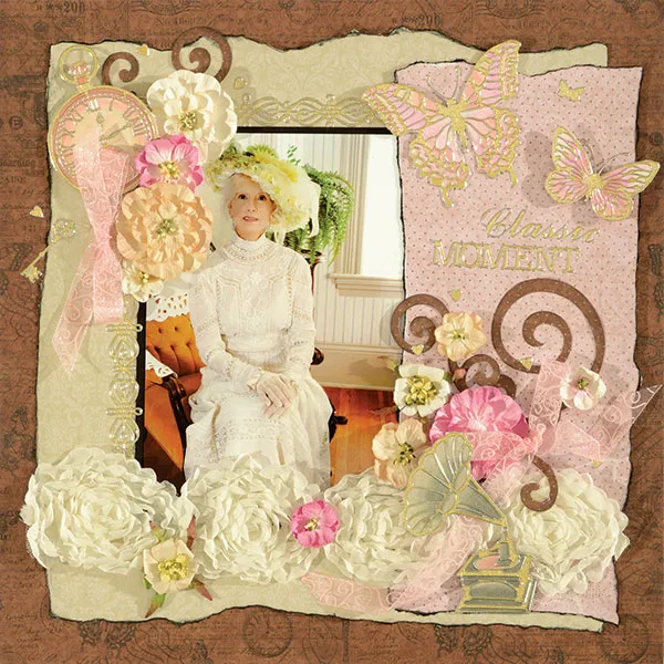 Glue and foam tape the butterflies on the top right side of the top right side of the page. Place a tiny butterfly among them. Zot™ a Soft Pink blossom with an Antique Beige Blossom among the swirls above the rose border. Zot™ a Soft Pink Blossoms on the border as shown. Use a 1/2” length of pink swirl On Butterfly Wings ribbon to make a bow with 5” and 3” long tails. Zot™ to the right of the flower cluster with the long tail among the rose border as shown. Foam tape the phonograph as shown.