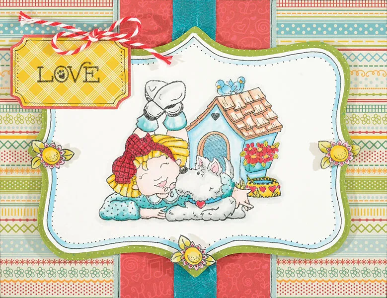 Color in the large stamped image with Chameleon™ pens as follows, using the light to dark method as given in the technique above. Color in the sides and inside of the doghouse with the Sky Blue pen, infusing the pen as needed. Color in the birds, dog collar, and the dog’s water with the same pen. Color in the roof and doorway of the doghouse with the Fawn pen. Color in the little girl’s hair, the flower centers, and the background of the dog’s water bowl with the Warm Sunset pen. Color in the girl’s clothing/socks and the flower box with the Aqua Marine pen. Color in the heart on the dog’s collar and the hearts on the bowl with Crimson Red. Color in the dog and the little girl’s shoes with the Cool Gray pen. Color in the little girl’s skin with the Bisque pen.
