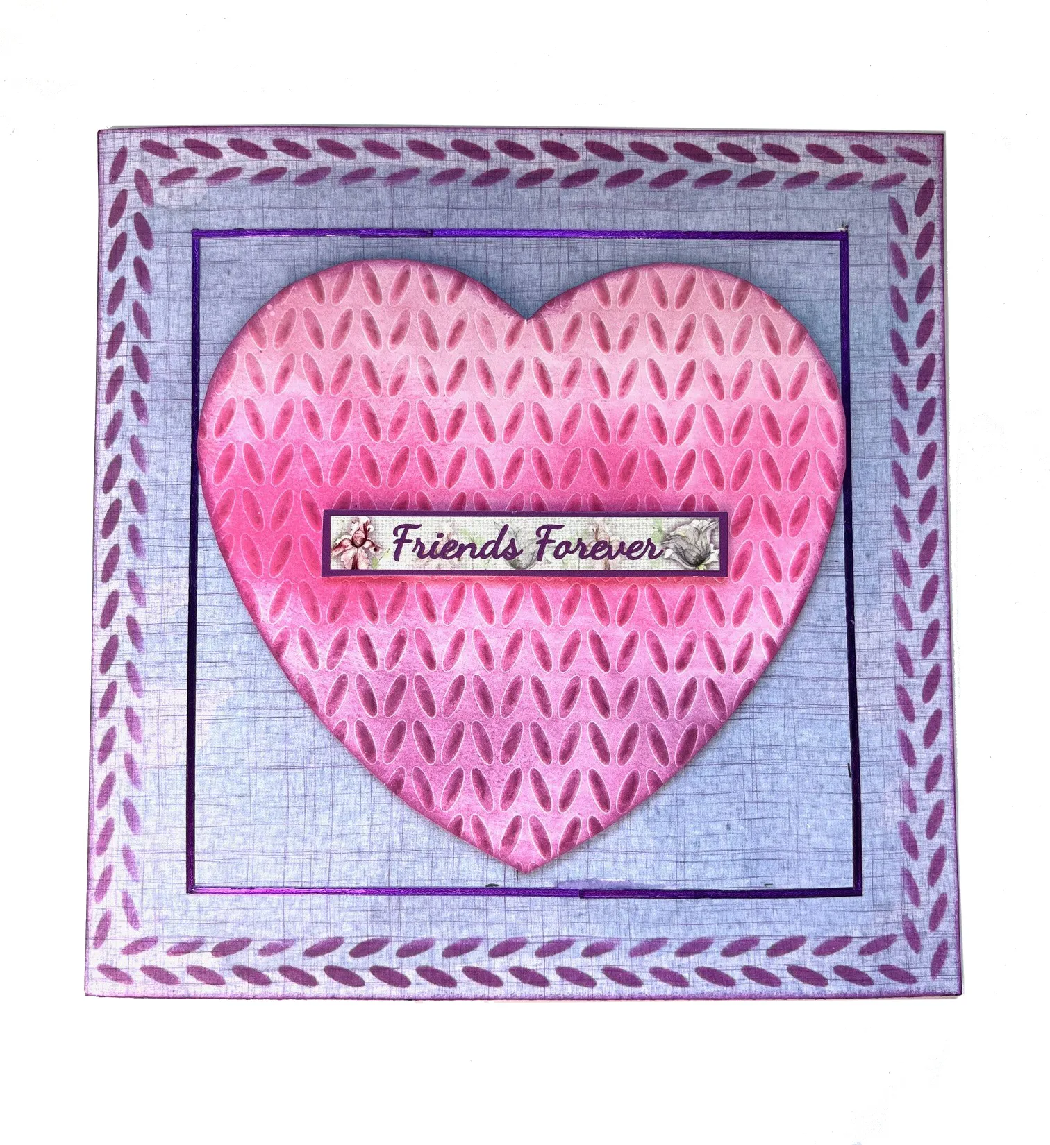 Use the Blending tool to lightly rub the 3 inks over the raised areas of the heart in 3 equal sections creating an Hombre affect. In the edges of the heart with the Orchid ink. Foam tape to the center of a 6” X ray Flowers purple Linen paper. Use the Orchid Ink on the frame of the stencil to create a frame around the heart.