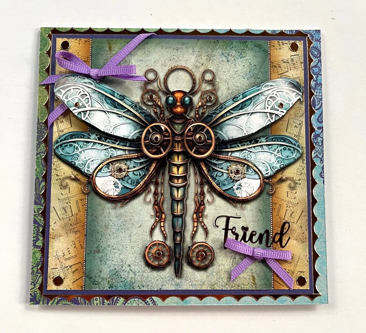 Cut a 5"x6 1/2" card to a 5"x5" square with the fold on the top. Cover the card front with the tape runner and place the blue/green Luscious Lace Patterned cardstock on top flush to all sides and trim off the excess. Cut the steampunk dragonfly page down to 4 1/2" square and mat on purple Solid cardstock leaving a 1/8" purple border. Wrap a 4" purple ribbon around the top left corner securing to the back with extra sticky tape. Glue to the card with the tape runner. Place copper Border Jewel Dazzles™️ along the outside edges of the purple cardstock.