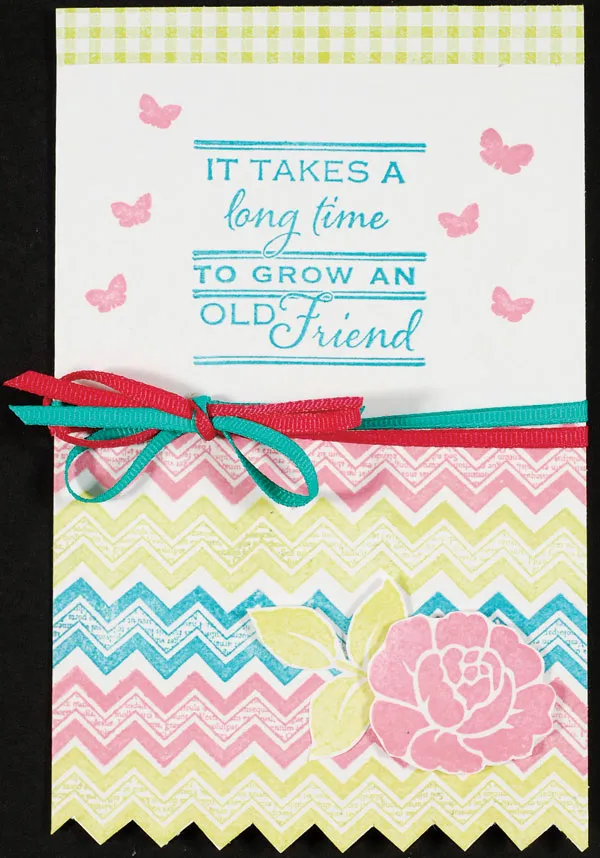 Inside: Cover the inside back with lime gingham paper. Close the card and cut below the bottom chevron border on the card front, cutting through both layers. Stamp a greeting in arctic deep and glue/foam tape a leaf and rose to the bottom right corner.