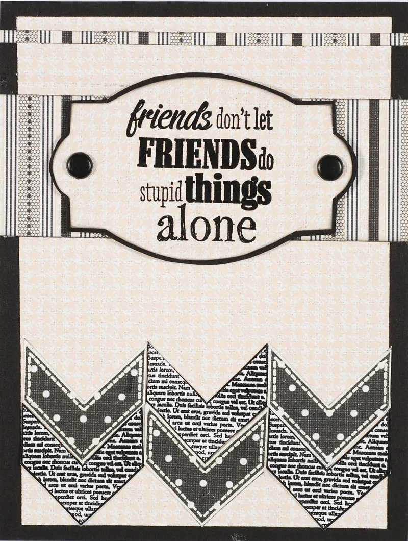Ink the edges of 5” x1 3/4” striped paper and glue 1 1/4” from the card top. Glue a 5”x 1/4” strip 3/8” from the card top. Stamp and emboss a black greeting onto ivory houndstooth and trace with Squared Oval shape from the template. Ink edges and mat with black cardstock, leaving a 1/16” border. Secure black brads at each end and foam tape over wide striped border.