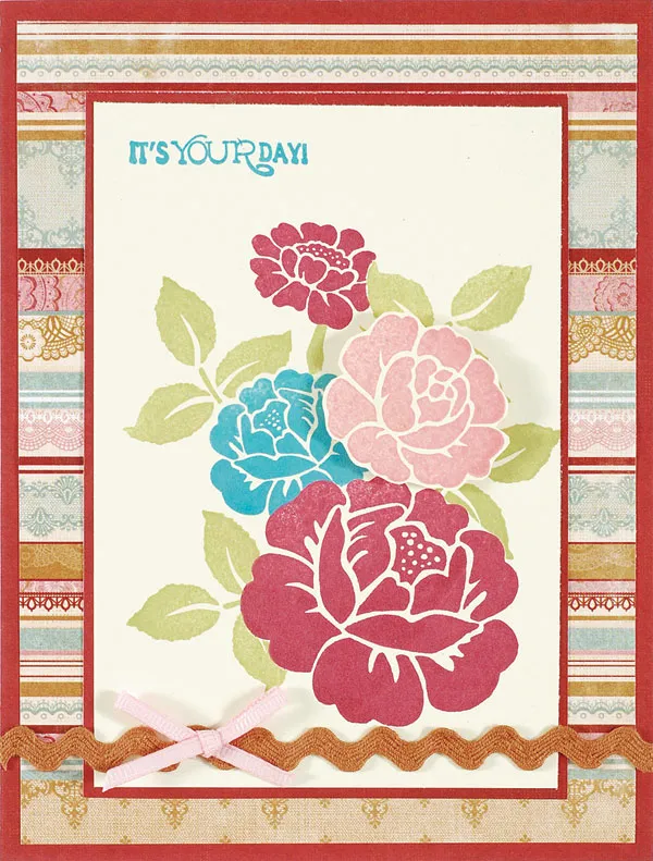 Mat the ivory rectangle with dark red paper, leaving a 1/16” border. Glue to the center of the card. Glue a length of caramel rick rack across the bottom of the ivory paper. Zotä a small pink grosgrain bow to the left side of the rick rack border.
