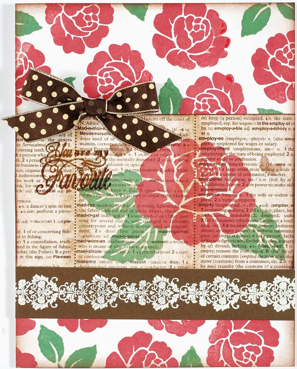 Place the card fold at the side. Stamp medium rose blossoms 2 1/2” from the top of the card and 1 1/2” from the bottom. Stamp green leaves around card edges, between the blossoms.