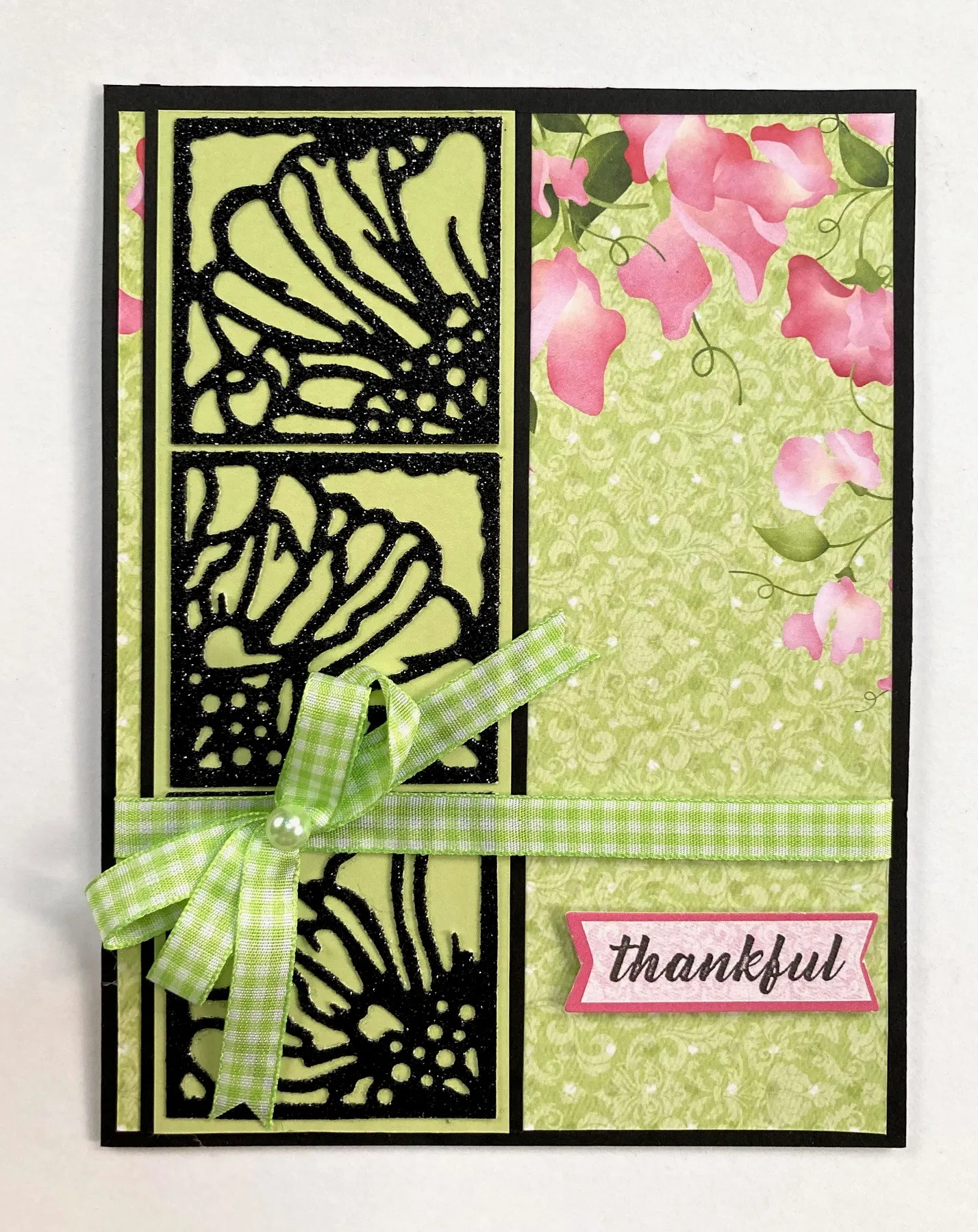 3. Make a 4-loop bow with lime gingham ribbon and tie the center with thread. Glue it to the first ribbon, 1" from the left edge, then place a large pale green pearl in the bow center. Foam tape the “thankful” die-cut at the lower right.