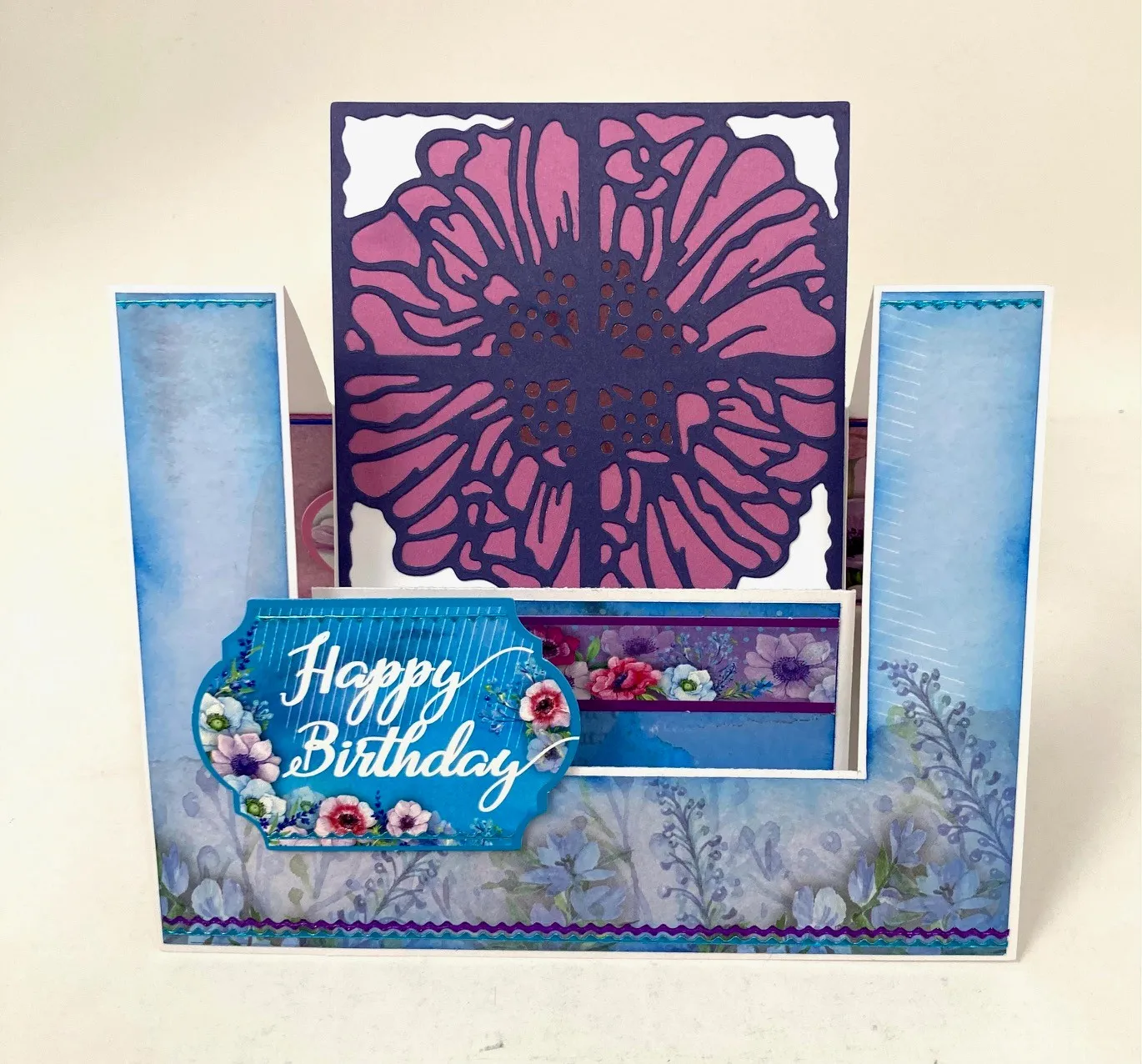 3. Cut 3¾"x1⅝" Windflowers blue patterned cardstock and ink the edges with Royal Blue. Cut a 3¾" length of the purple Windflowers border die-cut and glue it near the upper edge of the blue cardstock. Glue the cardstock centered on the middle step. Place teal thin line Dazzles™ near the upper and lower edges of the “happy birthday” die-cut, trimming the excess. Foam tape the greeting to the front as shown.