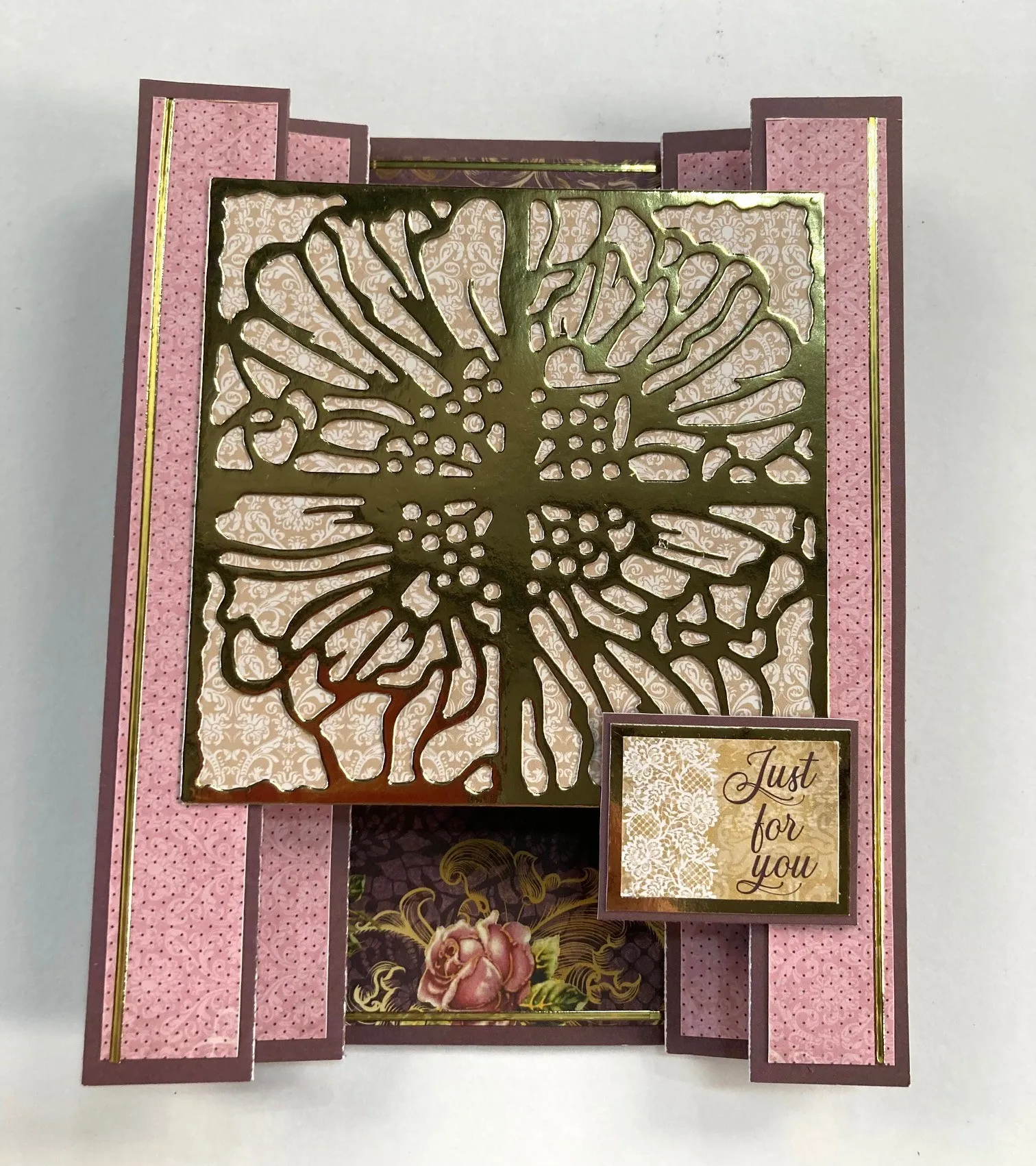 5. Die cut the frame from gold Mirri and glue it to Chantilly Lace ivory tapestry cardstock, trimming along the edges. Place sticky tape near two side edges. Flatten the card on the folds and attach the frame to the front panels, ⅝" from the top. Mat the “just for you” cutout on gold Mirri, then on solid burgundy cardstock, both with narrow edges. Foam tape it to the front as shown.