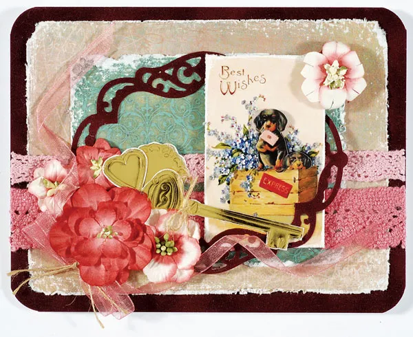 Follow your die cutting machine manufacturer’s instructions to cut a large lacy label die-cut from suede and center over the green paper. Sand the edges of the 3D “Best Wishes” puppy tag and foam tape on the end of the label, tucking the bottom end under the inner edge of the label.