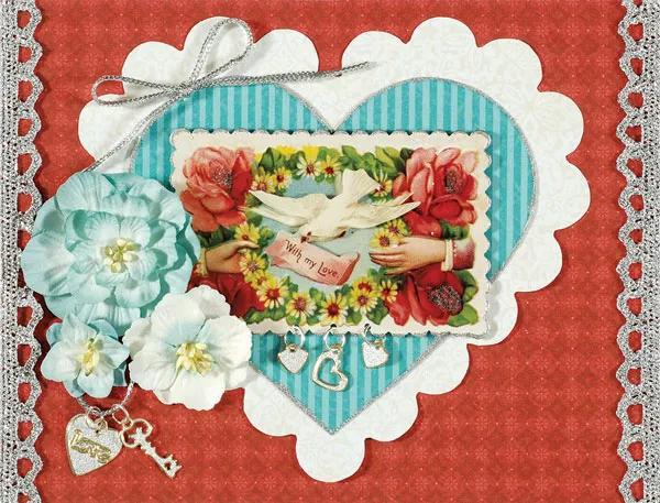 Ink the edges of the “With my Love” tag with VersaMark™ and emboss the edges as in step # Punch three 1/16” holes centered and evenly spaced along the bottom edge of the tag. Place pairs of small hearts Silver Charms Dazzles™ together back-to-back and add a jump ring to each. Add the jump rings to the holes on the bottom of the tag. Place the tag centered on the blue striped heart.