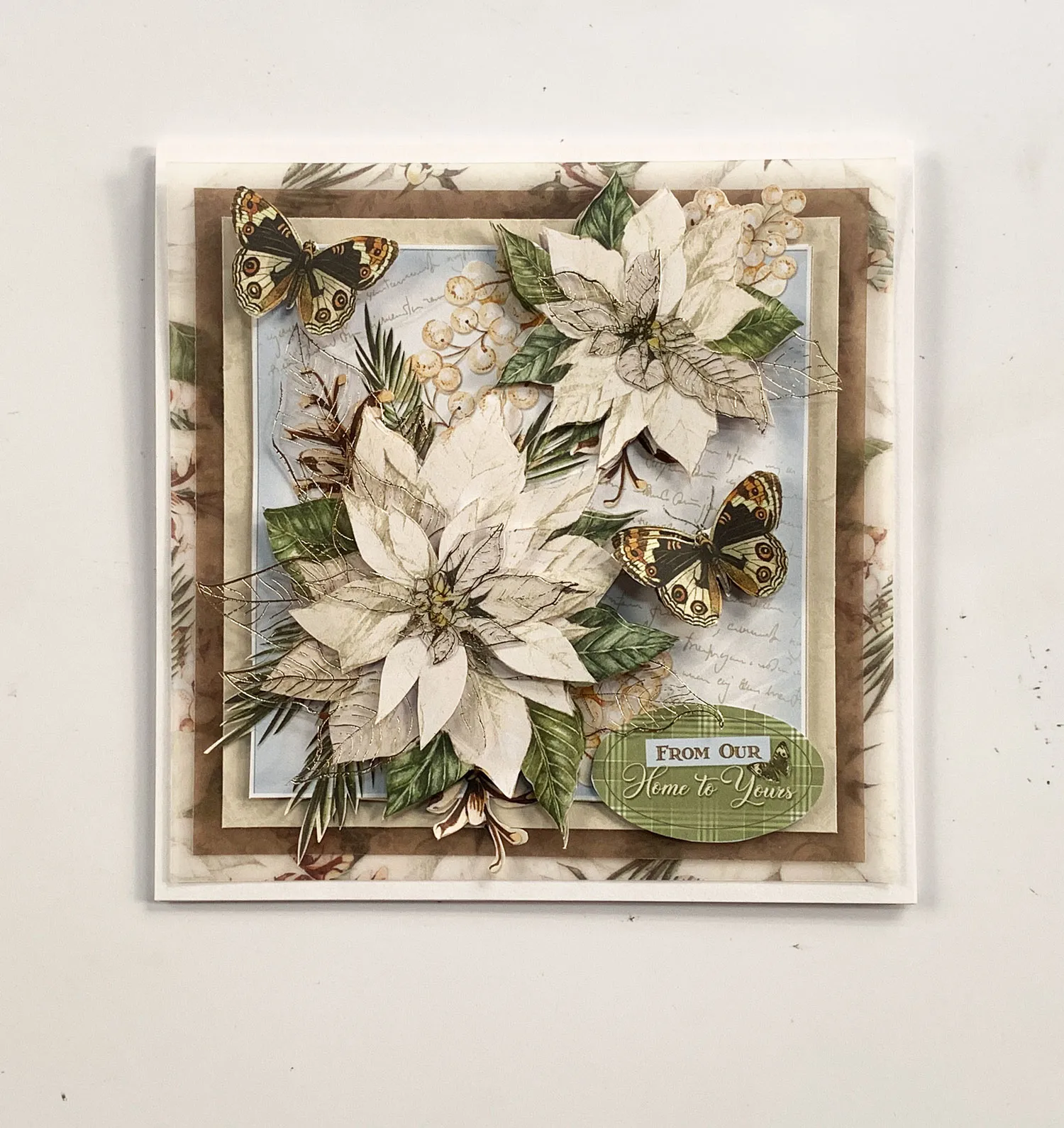 Cut out poinsettias and leaves from the foiled acetate along with more poinsettias from the additional pages of the same image from The Little Book. Layer with foam tape as shown. Repeat with the butterflies and fold up the wings on the top layer. Glue the assembled piece to 4 3/8” square brown parchment. Mat on poinsettia printed parchment leaving a 1/4" of the printed parchment showing. Glue to the white card leaving a 1/8" white border. Glue the oval "From our Home..." cutout from the book at the bottom.
