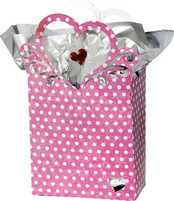Bag: Select the heart bag from the silhouette library and cut from the pink polka dot paper. Assemble the box according to the fold lines and slits.