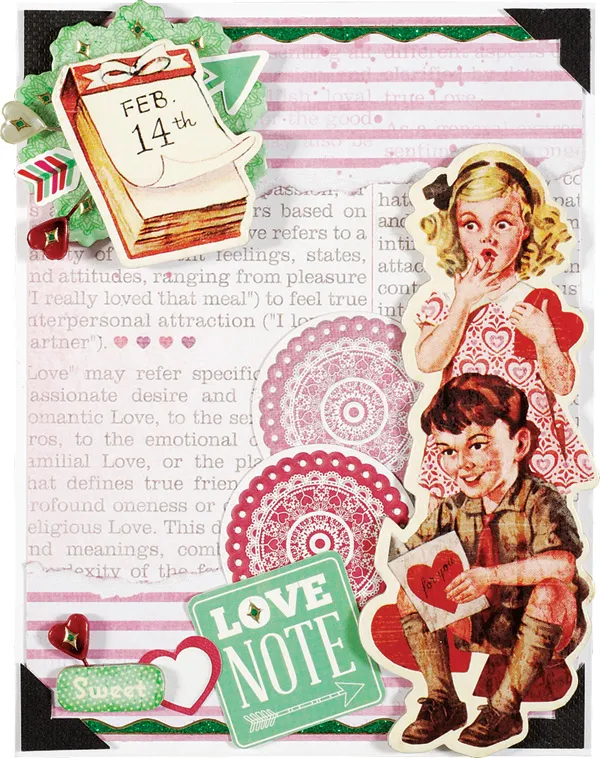 Place two doily stickers, “Love Note” sticker and small heart sticker under edge of boy/girl chipboard piece, as shown. Cut part of the pin shank off of a heart pin, stick into “Sweet” chipboard and place as shown.